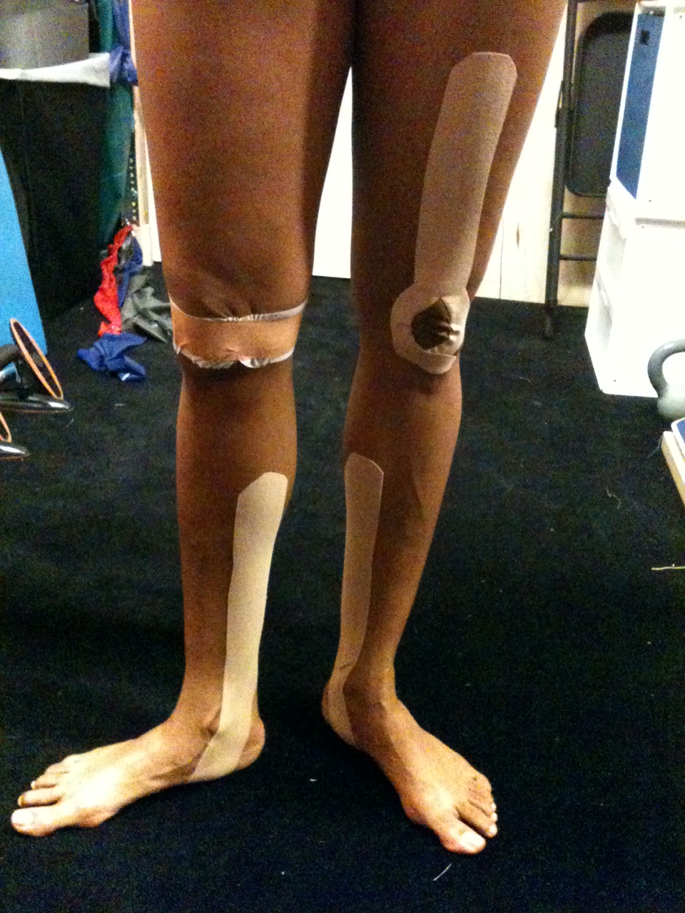 Combination of kinesiotaping and McConnell taping to help a performer.